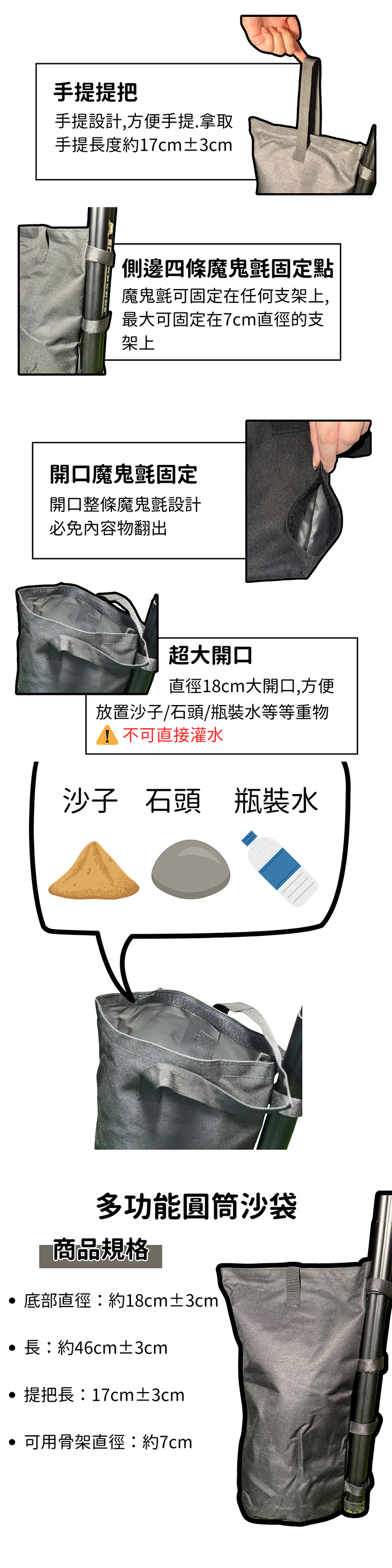 ◍ 直徑18cm大開口,方便放置沙子/石頭/瓶裝水等等重物。