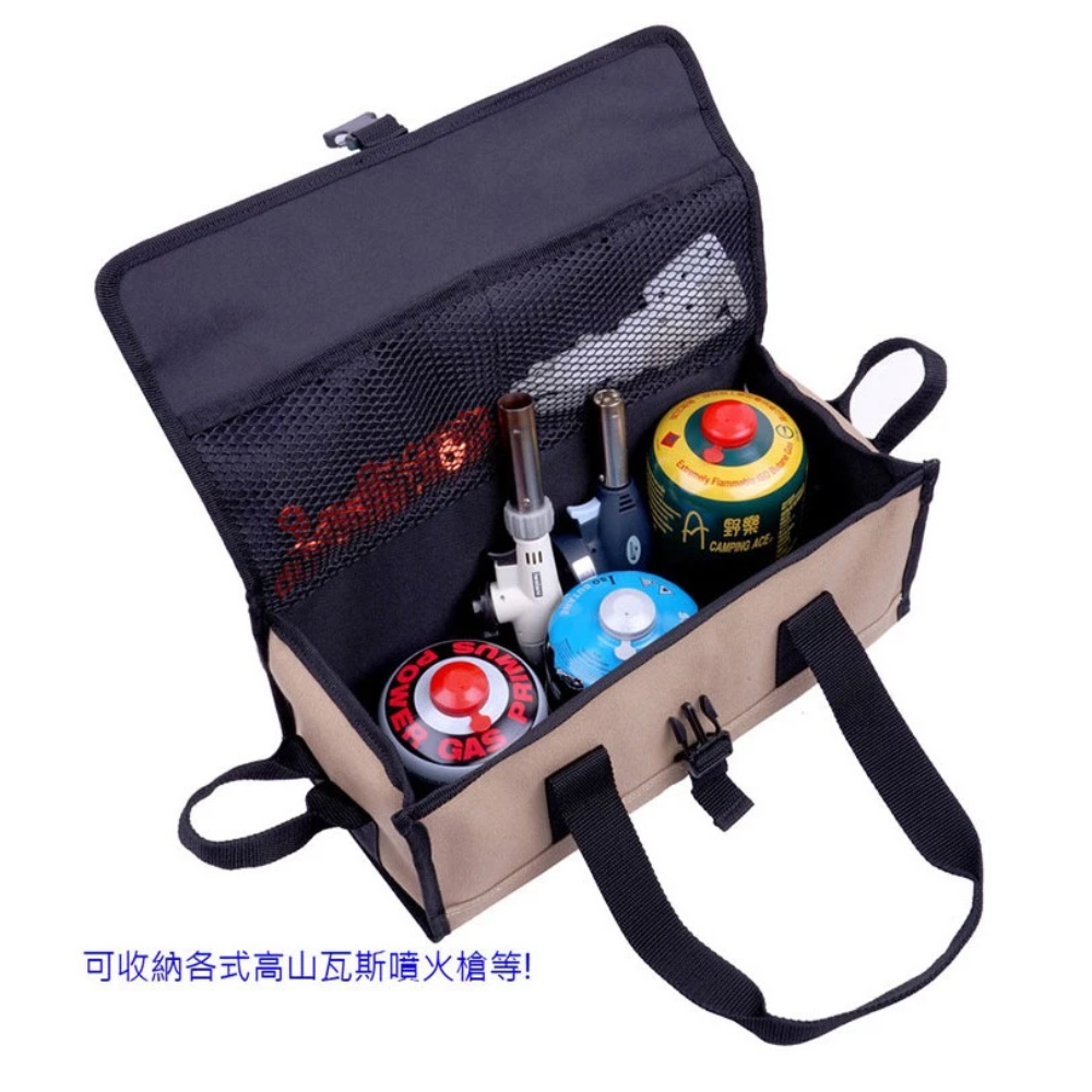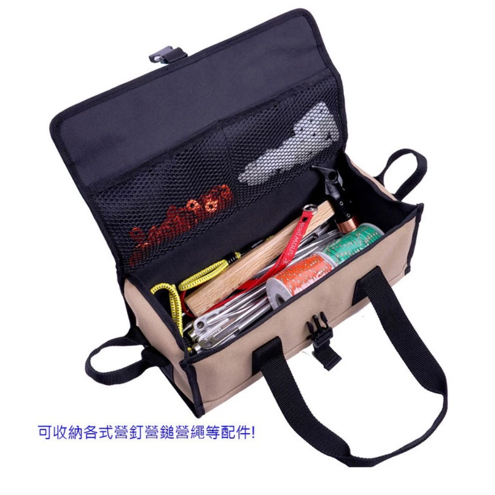 ◍ 萬用帆布工具袋可收納各式營釘、營槌、營繩、防雷帽、餐具、S掛勾、調節拉繩、調節片、燈勾、餐具廚具刀具、碗筷、料理剪刀、 瓦斯等用具。
