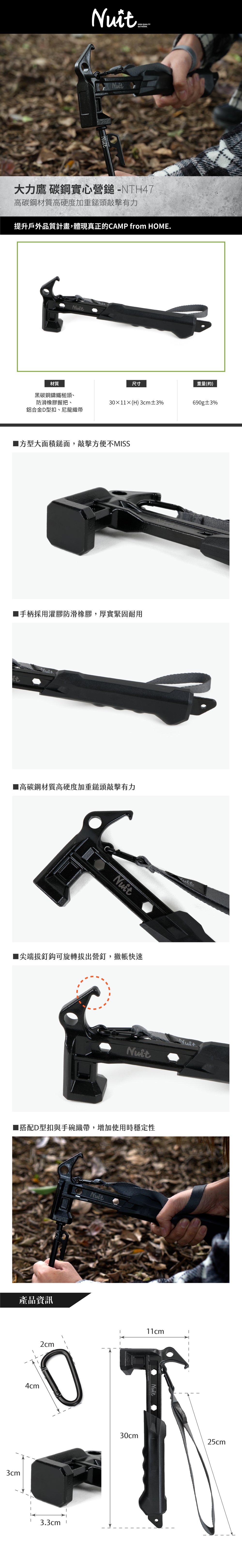 .材質:黑碳鋼鑄鐵槌頭、防滑橡膠握把 、 鋁合金D型扣 、 尼龍織帶