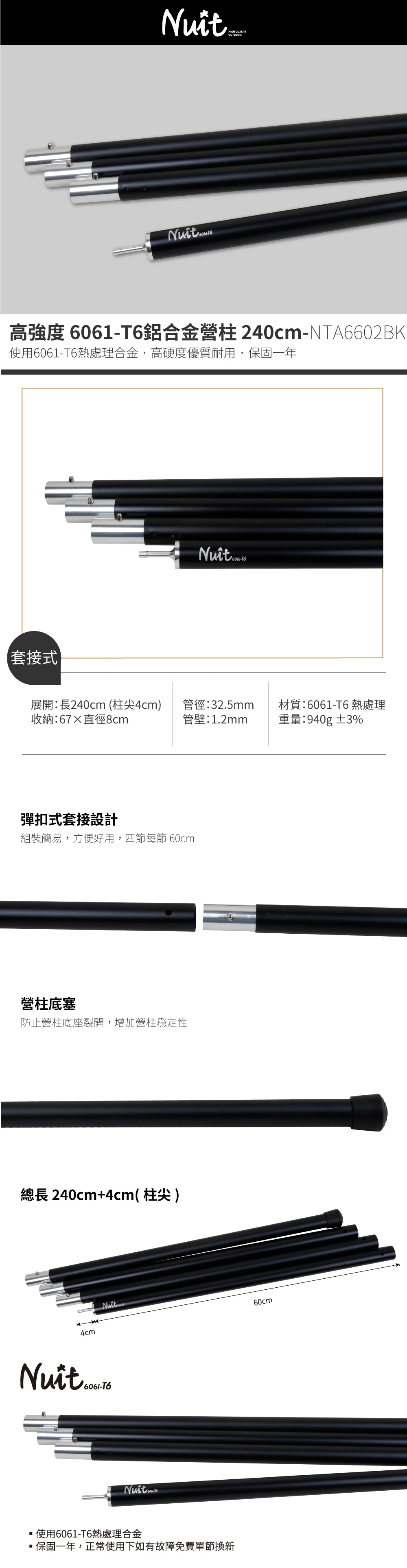 NUIT 努特 | NTA6602BK 高強度6061-T6鋁合金營柱240cm | 黑 套接營柱