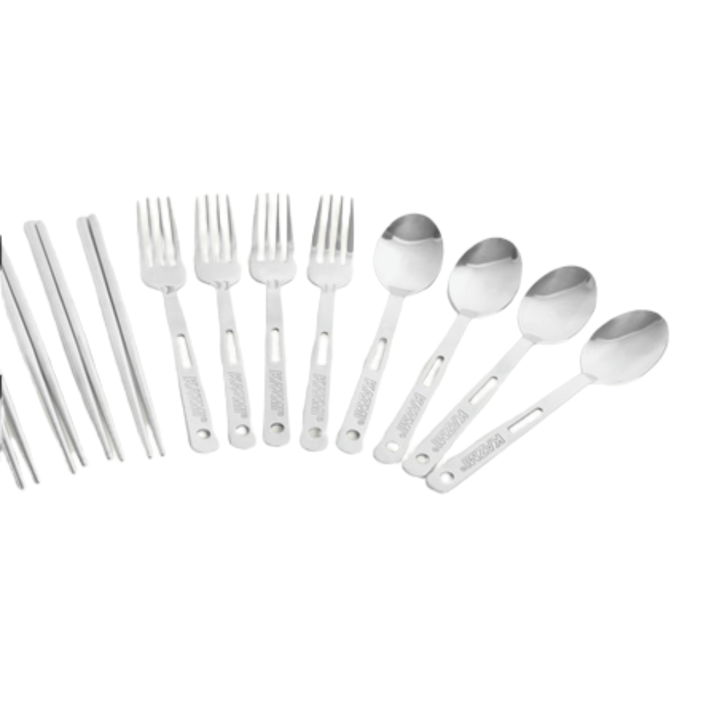 .內容物:筷子x4、叉子x4、湯匙x4、收納罐x3、原木底座x1、收納袋x1