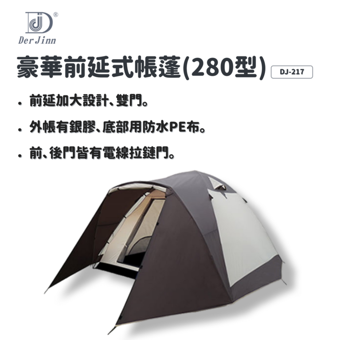2.前後開〝D〞型門,內有尼龍布置物袋,帳頂設懸吊營燈之環帶。